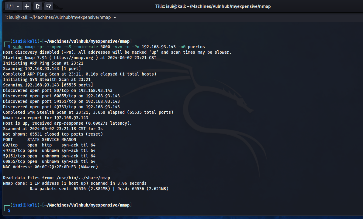 sudo nmap -p- --open -sS --min-rate 5000 -vvv -n -Pn 192.168.93.143 -oG puertos