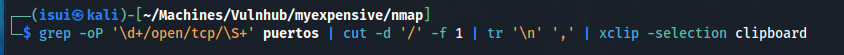 grep -oP '\d+/open/tcp/\S+' puertos | cut -d '/' -f 1 | tr '\n' ',' | xclip -selection clipboard