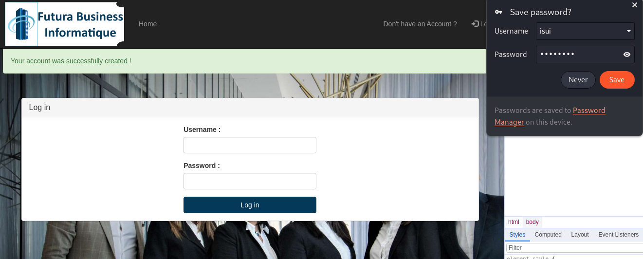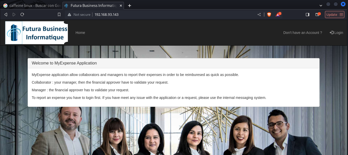 Usted es “Samuel Lamotte” y acaba de ser despedido de su empresa “Furtura Business Informatique”. Lamentablemente, debido a su salida apresurada, no tuvo tiempo de validar su informe de gastos de su último viaje de negocios, que todavía asciende a 750 € correspondientes a un vuelo de regreso a su último cliente. Temiendo que su antiguo empleador no quiera reembolsarle este informe de gastos, decide hackear la aplicación interna llamada “MyExpense “ para gestionar los informes de gastos de los empleados. Así estarás en tu coche, en el aparcamiento de la empresa y conectado a la red Wi-Fi interna (la llave aún no ha sido cambiada después de tu salida). La aplicación está protegida mediante autenticación de nombre de usuario/contraseña y espera que el administrador aún no haya modificado o eliminado su acceso. Tus credenciales fueron: samuel/fzghn4lw