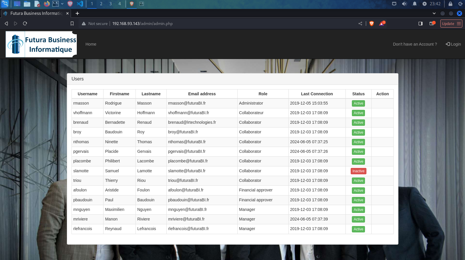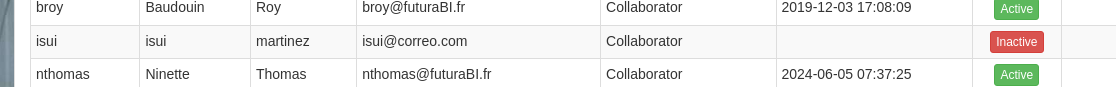 Se despliega una lista de los usuarios, nombres, correos, rol, y estado de su cuenta, en nuestro caso particular la cuenta de Samuel, se encuentra inactiva. En base al escenario, y reconocimiento, se puede inferir que el usuario, ya que se cuenta desde el comienzo con la contraseña: