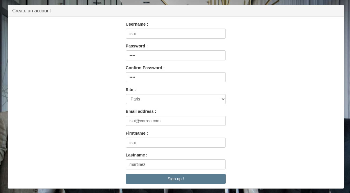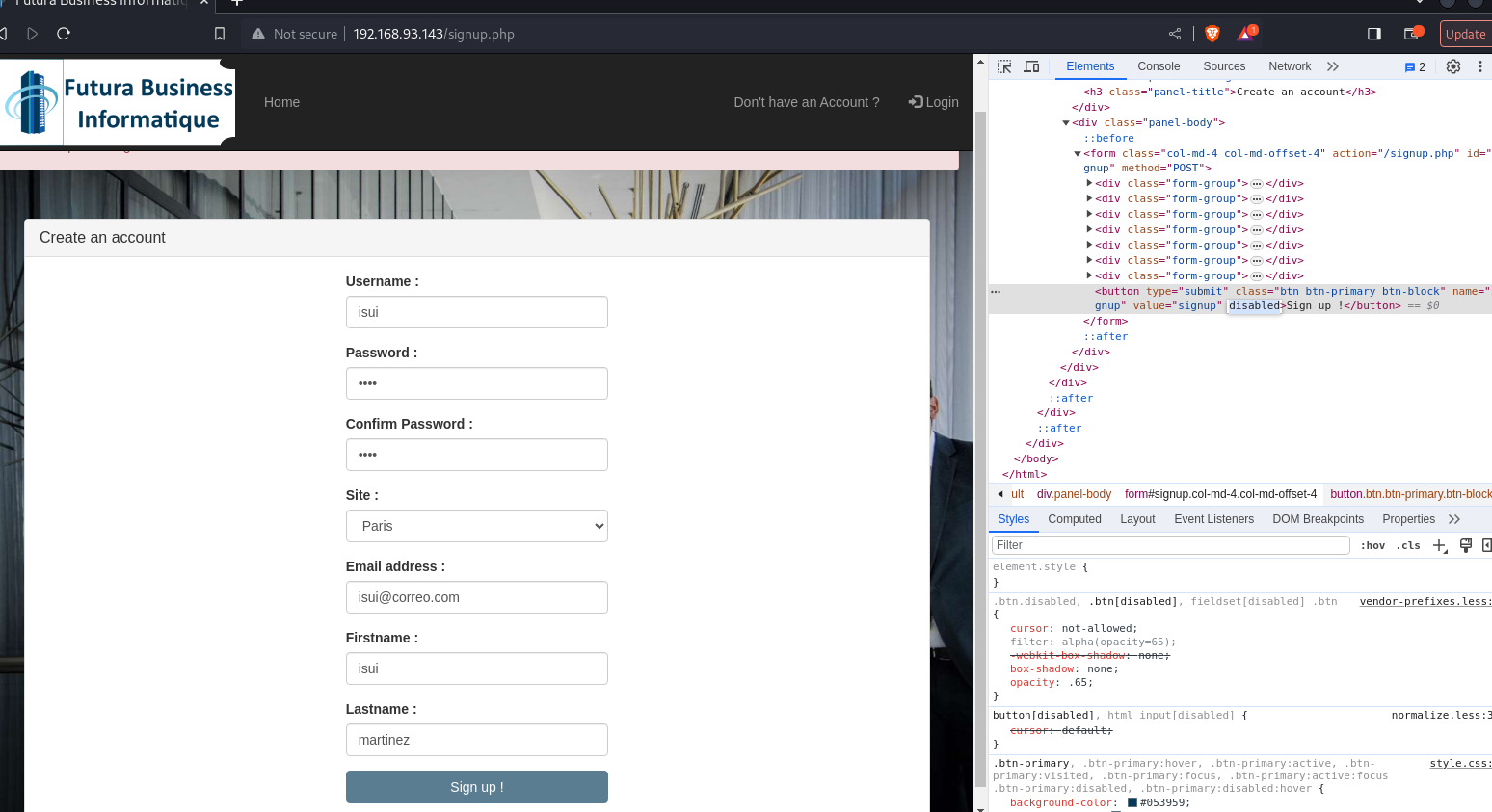 Se observa que hay un formulario para registrar usuarios, lo que puede permitir ver como se realizan las peticiones al servidor cuando se ejecuta dicho formulario. Se observa que el botón de Sing up! se encuentra deshabilitado: