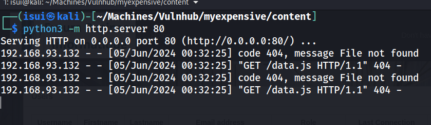 Para validar que este tipo de ataque, es posible, dede la máquina del atacante, se levanta un servidor http, con python, que deberia registrar los intentos solicitudes para cargar el recurso data.js.
