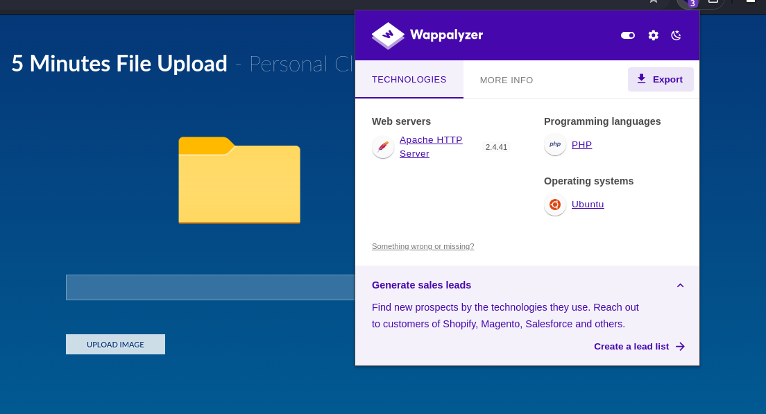 Puedo ver que se trata de un aplicativo que supuestamente, me deberia dejar de subir algún archivo al servidor. Para saber que lenguaje de programación utiliza el servidor, utilizo la extensión de Wappalyzer que ya tengo instalada:
