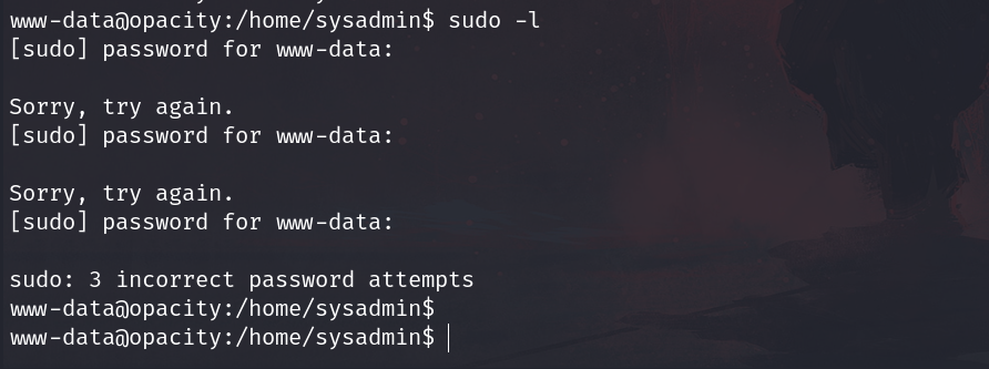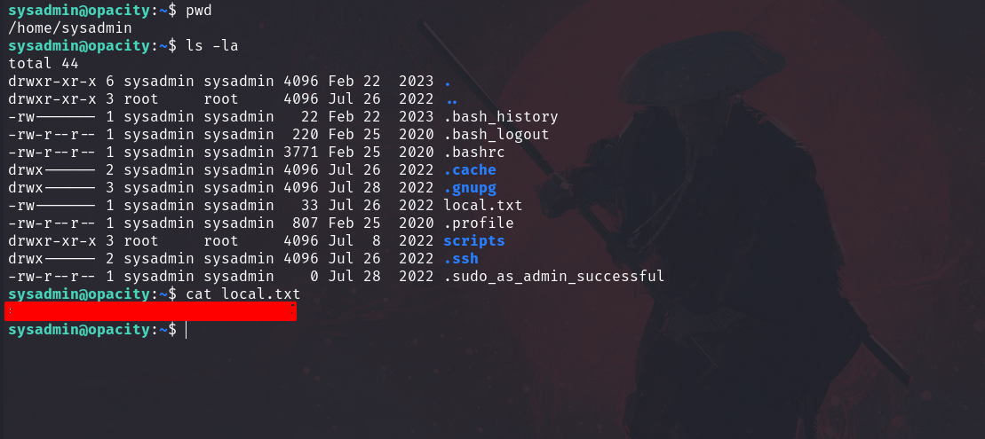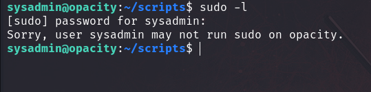 Encontré la primer bandera, pero no tenia el acceso suficiente, ya que el usuario sysadmin es quien tiene permisos: