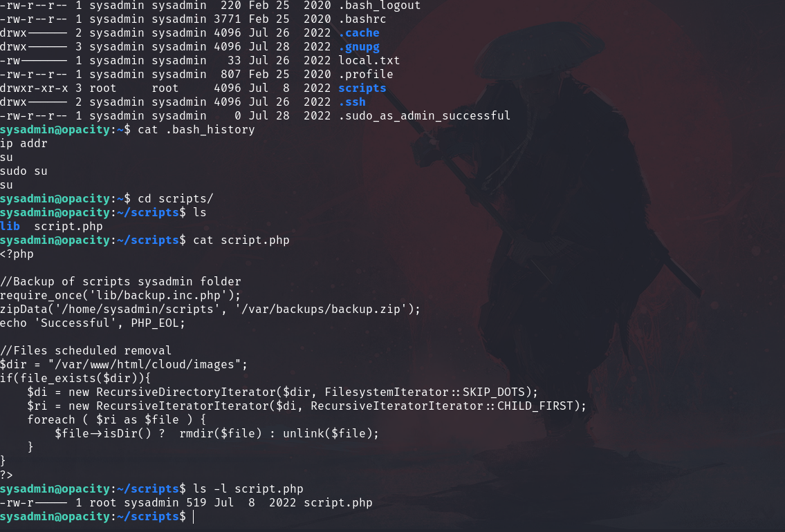 Comencé a enumerar todos los directorios y archivos que encontraba, y me di cuenta, revisando el historia de bash, que había accedido anterior mente como administrador. Además encontré una carpeta que no es usual scripts, la revise y encontré un script en PHP, que al revisar los permisos me di cuenta que tenia permisos de root: